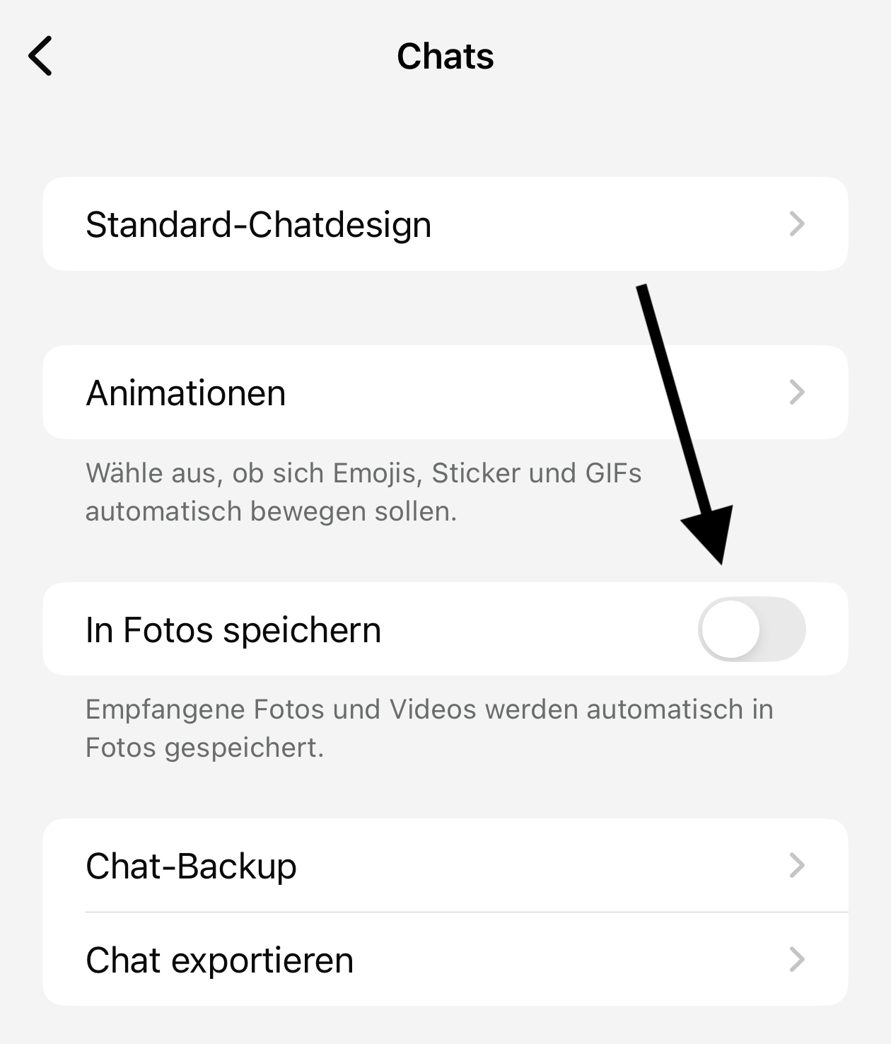 Empfehlung: Auch würde ich empfehlen die Einstellung - “In Fotos speichern” in WhatsApp auszuschalten, dann werden die Fotos nicht immer sofort in die Fotomediathek abgespeichert sondern nur die, die ihr aktiv auswählt und in der Fotosmediathek speichert.
