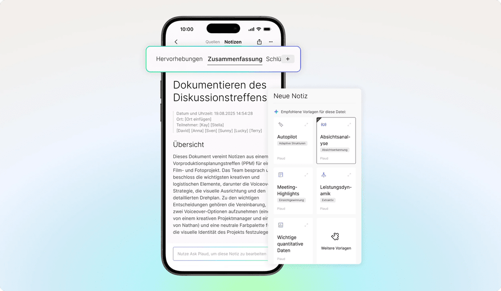 Die KI erstellt aus den Sprachinhalten automatisch Notizen, extrahiert Kernaussagen und Action Items.